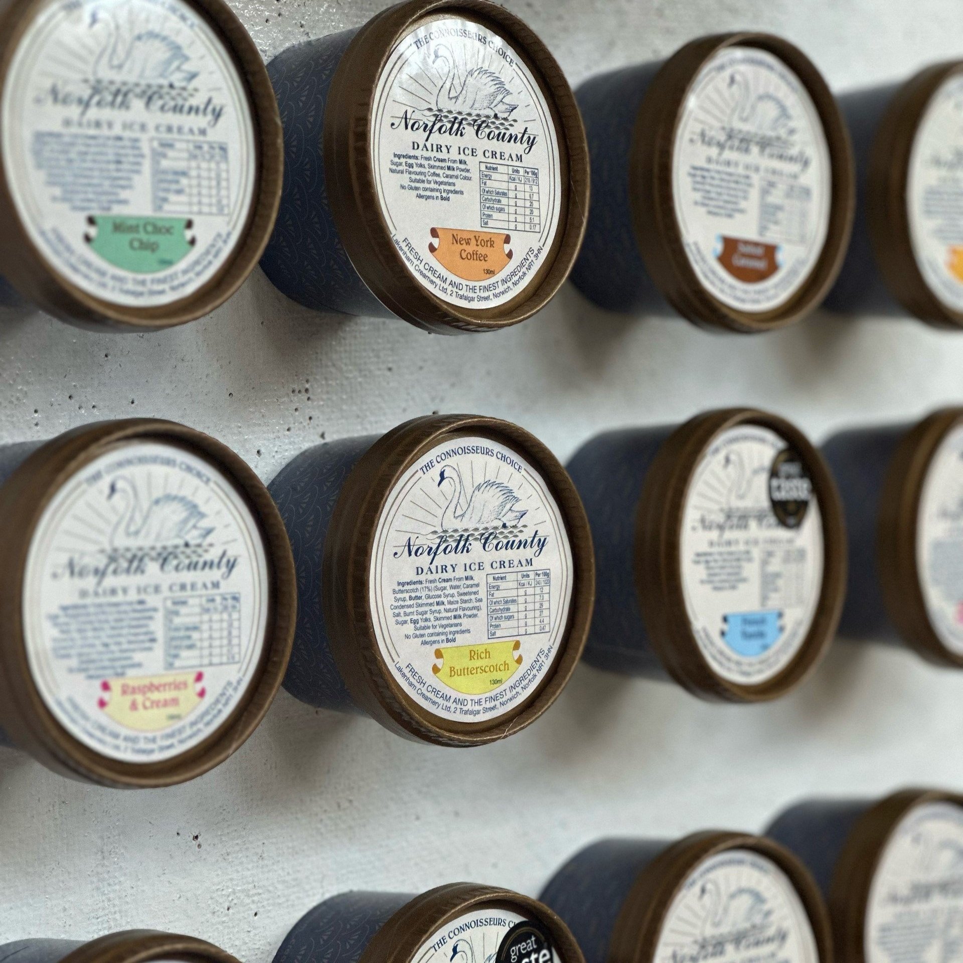 Our Norfolk County Fresh Cream Ice Cream is available in 130ml individual pots, featuring 12 indulgent ice cream flavours and 2 refreshing vegan sorbets.